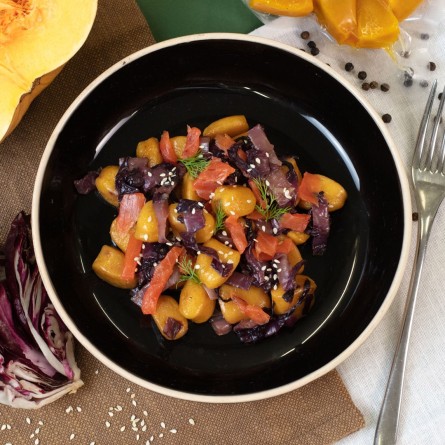 Gnocchi di zucca (purea di patate, zucca, FARINA di GRANO TENERO tipo 0, amido di mais, UOVA, sale, olio di semi di GIRASOLE), radicchio, trota salmonata affumicata (filetto di trota IGP e miscela di spezie), BURRO, zucchero, olio di semi vari (semi di SOIA e GIRASOLE), aceto balsamico, sale.