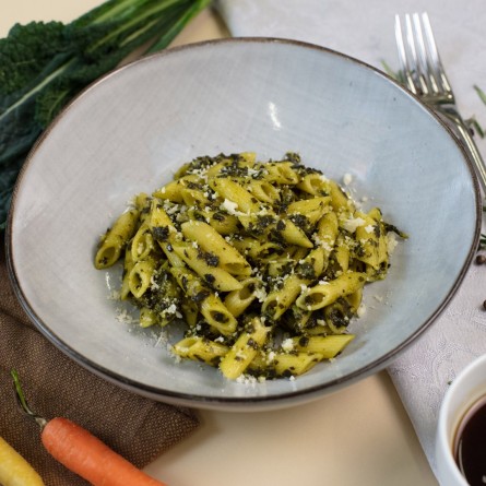 Penne (SEMOLA di GRANO DURO, acqua), cavolo nero, olio di oliva, pinoli, formaggio Grana grattugiato (LATTE vaccino, caglio, sale), sale, GRANELLA di PISTACCHIO, aglio in polvere.