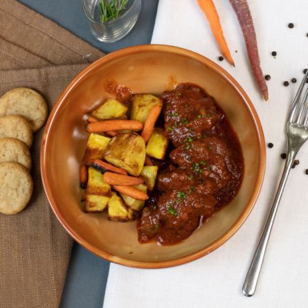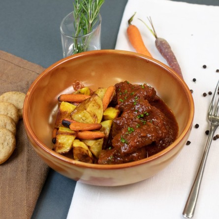 Patate, carote, manzo, soffritto* (SEDANO, carote, cipolla), riduzione di vino rosso (SOLFITI), BURRO, olio Evo, concentrato di pomodoro (pomodoro, sale), amido di mais, rosmarino disidratato, salvia disidratata, aglio in polvere, pepe nero.