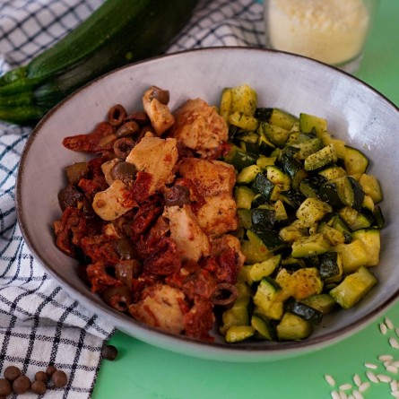 | Petto di pollo | Zucchine | Pomodori secchi | Olive |